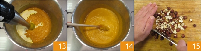 Tritura con una batidora de inmersión para mezclar 13; debe quedar lisa y cremosa 14. Pica groseramente las avellanas con un cuchillo 15.