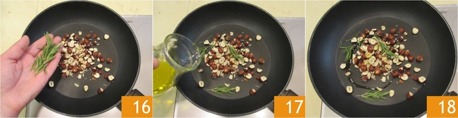 Coloca las avellanas en una sartén junto con el romero 16 y un chorrito de aceite 17 y tuesta durante unos minutos 18.