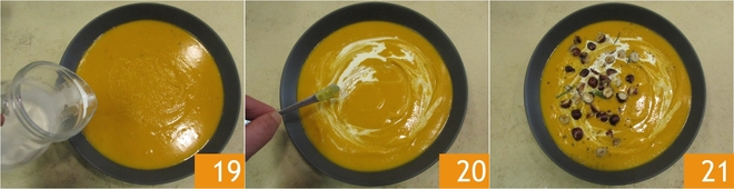 Decora los platos con la nata reservada 19, mezcla ligeramente 20 y completa con las avellanas tostadas y algunas agujas de romero: ¡tu crema de calabaza está lista para ser servida 21!