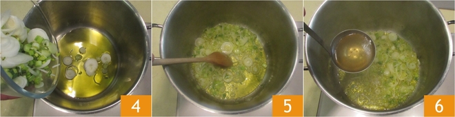 Calienta el aceite en una cacerola grande, añade el puerro y sofríelo durante unos minutos a fuego medio-bajo 4, removiendo para que no se queme 5. Si es necesario, puedes añadir un cucharón de caldo caliente 6.