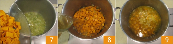 Cuando el puerro esté bien dorado, añade la calabaza 7 y mezcla durante unos minutos para que adquiera sabor, luego cubre con el caldo caliente 8. Cocina la calabaza removiendo con frecuencia, tardará unos 25-30 minutos 9.