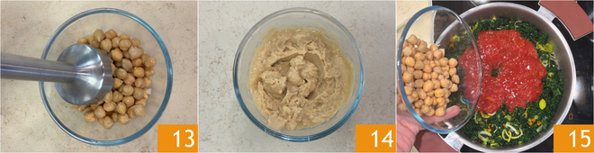 Mientras dejas que la col negra se ablande brevemente, tritura la mitad de los garbanzos con un poco de agua 13 para obtener una crema 14. Añade los garbanzos enteros a la cacerola 15.