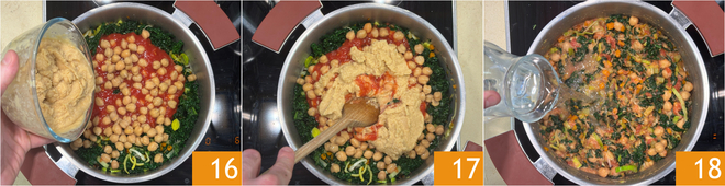 Añade también la crema de garbanzos 16 y mezcla bien para integrar todo 17. Cubre con el caldo de verduras 18 y continúa la cocción a fuego medio durante unos 20 minutos.