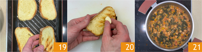 Mientras la sopa se cocina, tuesta las rebanadas de pan en una parrilla por ambos lados 19, luego frótalas con un diente de ajo 20. Transcurrido el tiempo de cocción, la sopa estará densa y sustanciosa 21.