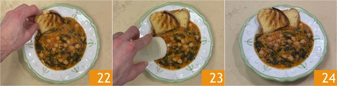 Completa cada plato con una rebanada de pan tostado 22, un chorrito de aceite 23 y una pizca de pimienta. ¡Tu sopa de col negra está lista para degustar 24!