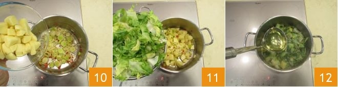 y añadid las patatas 10. Dejad que se aromatice por un instante, luego añadid también la escarola 11. Añadid abundante caldo 12 hasta cubrir todo.