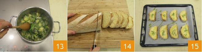 Salad y dejad cocer durante unos 30 minutos a fuego medio, removiendo de vez en cuando 13. Cuando la sopa de escarolas y patatas esté casi lista, preparad los picatostes. Cortad 8 rebanadas del pan de trigo duro 14 y colocadlas en una bandeja forrada con papel de horno. Rociadlas con un chorrito de aceite y colocad en cada una unas agujas de romero 15. Coced en horno estático precalentado a 220° durante unos 5 minutos.