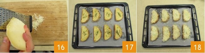 Mientras tanto, rallad el caciocavallo 16 y en cuanto los picatostes estén ligeramente dorados 17, utilizadlo para cubrirlos 18. Volved a meter en el horno durante otros 2-3 minutos,