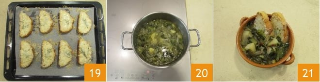 hasta que el queso se haya fundido 19. En este punto, también la sopa estará lista 20 y podréis servirla acompañándola con los picatostes al queso 21.