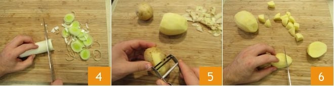 Cortadlo luego en rodajas 4 y pasad a las patatas. Peladlas 5 y cortadlas en cubos de unos 2-3 cm 6.