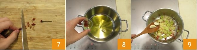 Finalmente picad también el chile 7. Ahora echad un chorrito de aceite en una cacerola, añadid los dientes de ajo y el chile 8; calentad y agregad también el puerro. Rehogadlo durante unos 4-5 minutos, removiendo de vez en cuando, luego eliminad el ajo 9