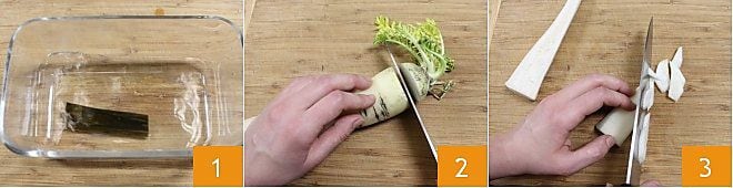 Para preparar la sopa de miso, primero pon en remojo en agua fría la hoja de alga wakame 1. Mientras tanto, limpia el daikon: corta la parte superior y la inferior 2, elimina la piel pelándolo con un pelador de patatas y córtalo finamente en pequeños trozos 3.