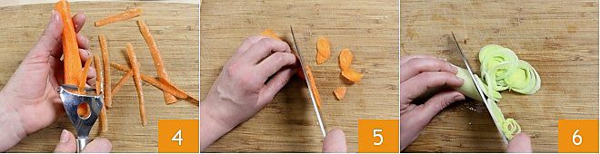 Pela las zanahorias 4 y córtalas también en pequeños trozos 5; quita las hojas más externas del puerro, elimina la parte verde y córtalo finamente 6.