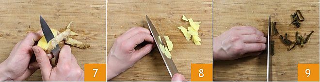 Pela el jengibre 7 y divídelo en pequeños trozos 8. Escurre el alga, ya suavizada, y córtala finamente en tiras 9 (haz clic aquí para saber más sobre este corte)