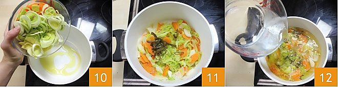 En una cacerola grande, sofríe ahora las verduras con un poco de aceite de oliva (o de sésamo) durante unos 10 minutos 10. Añade también el alga wakame 11, luego cubre las verduras con agua 12.