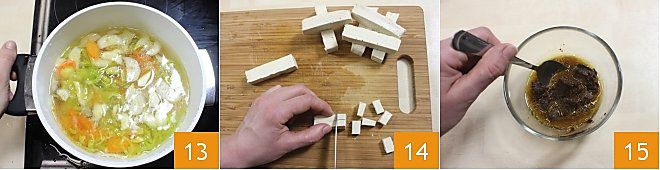 Deja cocinar todo durante unos 15 minutos 13. Mientras tanto, corta el tofu en trozos de aproximadamente 1 cm 14. Toma un cucharón de caldo de la sopa y utilízalo para diluir, en un bol pequeño, el miso 15.
