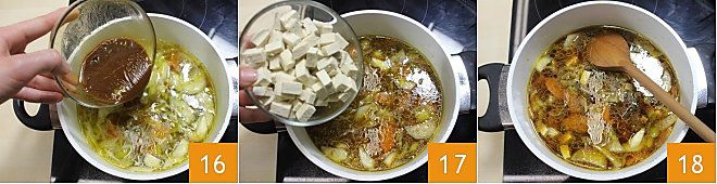 Añade a la sopa el miso diluido 16, el tofu 17, luego apaga el fuego, mezcla 18 ¡y la sopa está lista! Deja que se temple durante cinco minutos y sírvela bien caliente.