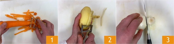 Para preparar la pastina en caldo, empezad limpiando la zanahoria 1, la patata 2, la cebolla 3 y el apio.
