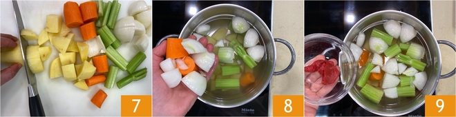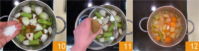 Ajustad de sal 10, luego encended a fuego medio, cubrid con la tapa 11 y dejad hervir suavemente durante unos 30 minutos, hasta que las verduras estén tiernas 12.
