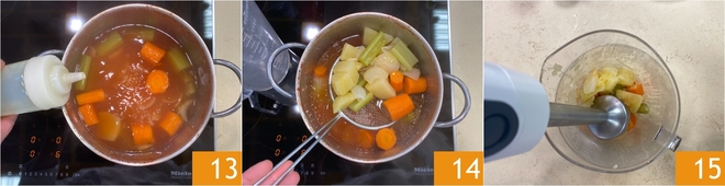 Transcurrido el tiempo de cocción, añadid un chorrito de aceite 13, luego escurrid las verduras 14 y transferidlas a un vaso. Triturad con una batidora de inmersión 15.