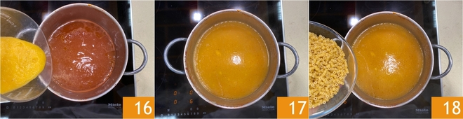 Verted nuevamente la crema de verduras en el caldo 16 y calentad hasta que vuelva a hervir. Añadid entonces la pastina 18.