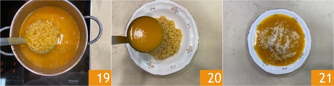 Coced la pastina durante el tiempo indicado en el paquete, removiendo de vez en cuando para evitar que se pegue al fondo 19. Si es necesario, podéis añadir un poco de agua caliente para ajustar la densidad. Una vez lista, servid la pastina en caldo bien caliente 20, completando cada plato con un chorrito de aceite de oliva virgen extra, Parmigiano Reggiano rallado y una pizca de pimienta negra a gusto 21!