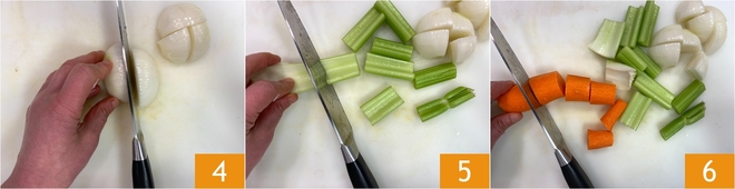 Enjuagad las verduras bajo agua corriente y cortad en trozos grandes la cebolla 4, el apio 5 y la zanahoria 6.