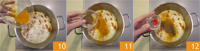 Condimentad con la cúrcuma 10, el garam masala 11, el chile 12 y el comino.