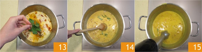 Por último, añadid el cilantro 13 y dejad cocinar durante unos 30 minutos 14. Batid la sopa con una batidora de mano 15.
