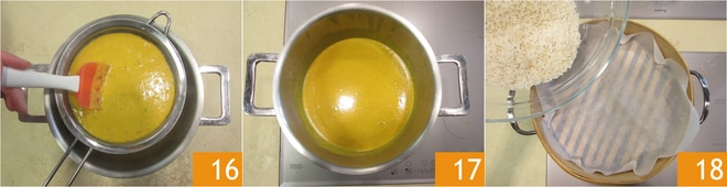Colad la sopa a través de un colador 16. Volved a ponerla al fuego. La sopa estará lista cuando esté cremosa 17. Mientras la sopa se cuece, ocupaos del arroz, vertedlo en la cesta de una vaporera forrada con papel de horno 18.
