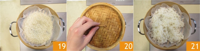 Distribuidlo en el fondo 19, cubridlo con la tapa 20 y cocedlo durante unos 10 minutos (si preferís, podéis cocerlo en agua hirviendo). Cuando esté cocido 21, apagad el fuego y escurridlo.