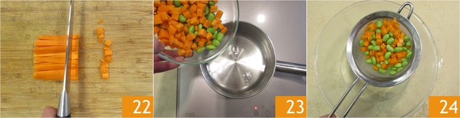 Cortad las zanahorias en cubos de aproximadamente 0,5 cm 22 y hervidlas junto con los edamame en agua salada durante 5 minutos 23, luego escurridlos y dejadlos aparte en un bol 24.