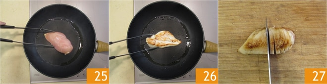 Sellad el pollo en una sartén antiadherente caliente con un chorrito de aceite 25, hasta que esté bien dorado 26. Cortad el pollo en rodajas 27.