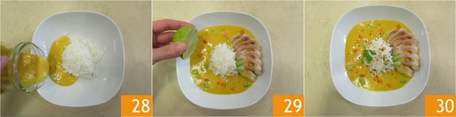 Todo está listo para emplatar: poned el arroz en el centro del plato y verted la sopa alrededor 28, luego espolvoread las verduras y colocad el pollo sobre la sopa. Condimentad con un poco de jugo de lima y poned las semillas de sésamo y los cacahuetes sobre el arroz. Vuestra sopa de pollo con arroz basmati está lista para ser servida.