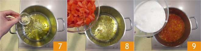 Incorporad también el ajo 7 y el jengibre y sofreíd hasta que estén suaves y dorados. En este punto, añadid los tomates 8. Dejad cocer hasta que los tomates se hayan ablandado (unos 15 minutos a fuego medio). Cuando los tomates estén ablandados, verted la leche de coco 9.
