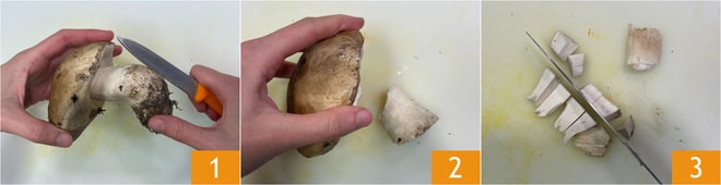 Para preparar la sopa de setas primero prepara el Caldo de verduras y mantenlo caliente. Ocúpate de limpiar las setas: elimina la tierra del tallo de los boletus con un cuchillito 1, luego frótalos suavemente con un paño. Separa el sombrero del tallo 2: corta el primero en rodajas y el segundo en cubos de aproximadamente 2 cm 3.
