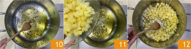 Deja que tome sabor durante un minuto 10, luego añade las patatas 11 y mezcla para dorarlas brevemente 12.