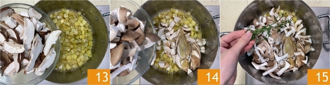 Agrega los tallos de los boletus 13, los pleurotus 14 y las ramitas de tomillo 15.