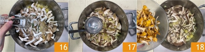 Sazona con sal y pimienta 16. Cubre con el caldo vegetal 17 y cocina durante 20 minutos a fuego lento. Pasado este tiempo, añade los rebozuelos 18.