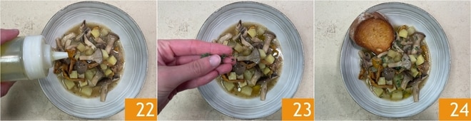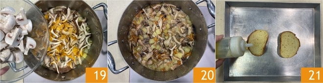 Añade también los champiñones 19 y las cabezas de los boletus. Si es necesario, vierte un poco más de caldo y ajusta de sal. Continúa la cocción durante otros 20 minutos 20. Mientras tanto, tuesta las rebanadas de pan en una bandeja en el horno estático precalentado a 180° durante unos 15 minutos 21.