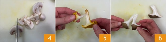 Limpia los champiñones y córtalos en cuartos 4. También divide los rebozuelos 5 y los pleurotus en cuartos, separándolos con las manos 6.