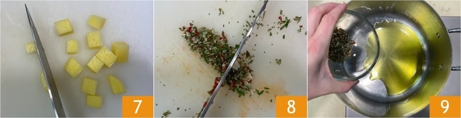 Pela y corta las patatas en cubos de 1,5 cm 7. Por último, pica finamente las agujas de romero, la guindilla y el diente de ajo sin el germen interior 8. En una cacerola, vierte un chorrito de aceite y el picado de romero, ajo y guindilla 9.