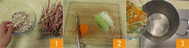Para preparar la sopa frantoiana, primero haga el puré de frijoles: desgrane los frijoles 1, obteniendo así unos 250 g. Pique groseramente una rama de apio, una zanahoria y una cebolla y reúnalos en una cacerola grande 3.