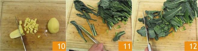 Pele y corte en cubitos también las patatas 1 y la zanahoria restante. Elimine la nervadura central del cavolo nero 11 y córtelo en trozos 12.