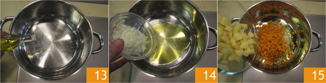 En una olla grande prepare un sofrito con el aceite de oliva virgen extra 13 y la cebolla picada 14 y agregue las verduras en trozos 15.