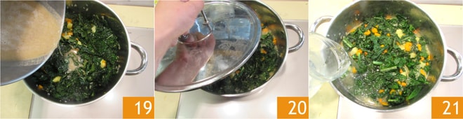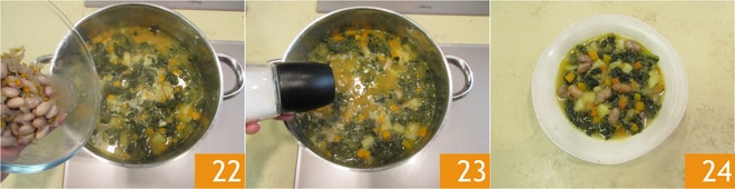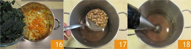 Añada también el cavolo 16. Deje dorar unos minutos. Mientras tanto, tome un poco de frijoles cocidos 17 y resérvelos. Triture el resto junto con las verduras y el agua en la que se cocinaron para obtener una crema homogénea 18.
