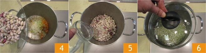 Agregue también los frijoles borlotti. Cubra con agua fría 5, aproximadamente 1,2 litros, y lleve a ebullición. Cocine a fuego lento, medio tapado 6, hasta que estén tiernos.