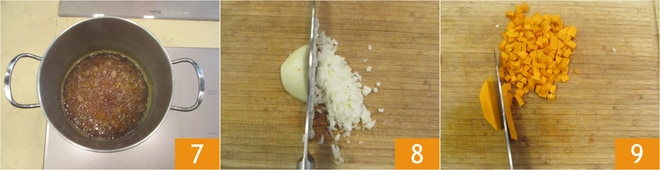Se necesitarán unos treinta minutos 7. Mientras tanto, limpie y pique la segunda cebolla 8, pele y corte en cubitos la calabaza 9.