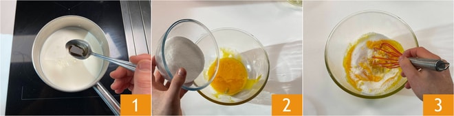 Para preparar la sopa inglesa de colomba, lo primero que hay que hacer es la crema pastelera: verted la leche en un cazo junto con el extracto de vainilla 1 y llevad a ebullición. Mientras tanto, colocad las yemas en un bol, batidlas ligeramente y añadid el azúcar 2. Mezclad bien con un batidor 3.