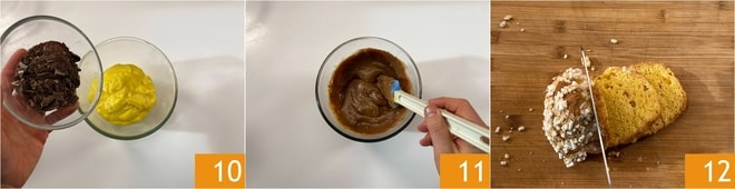 En el otro, añadid el chocolate rallado 10 y mezclad hasta que se derrita completamente 11, luego dejad enfriar. Ahora cortad la colomba en rebanadas de 1 cm de grosor 12.